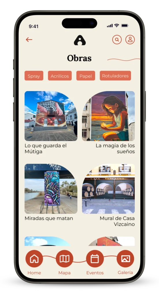 La app también incluye una zona interactiva de búsqueda de murales, donde los usuarios pueden localizar obras cercanas mediante un mapa o explorar por categorías, estilos o barrios. Esto facilita el descubrimiento espontáneo de arte urbano mientras se recorre la ciudad.